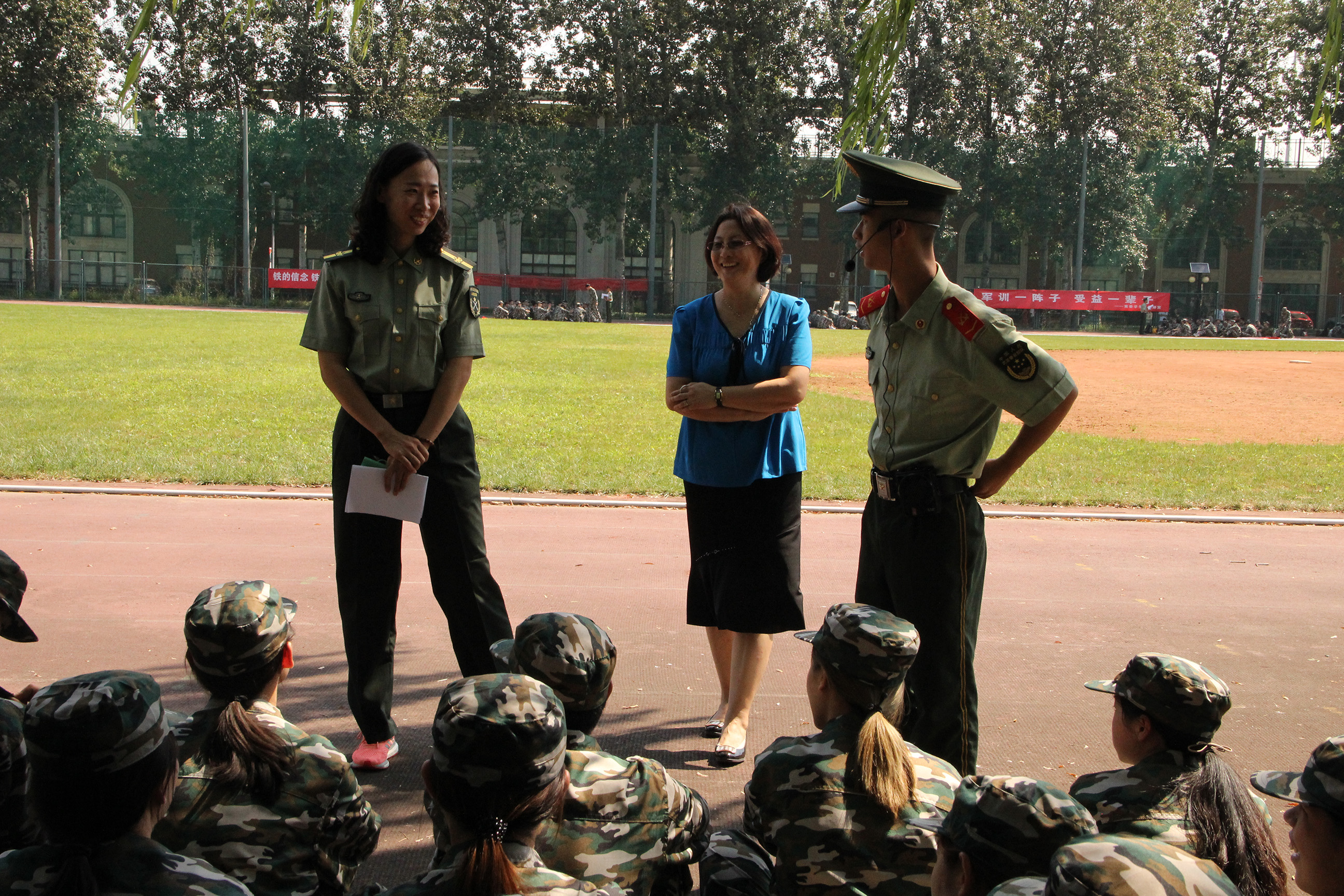 党总支书记蔡文菊在2018级辅导员王思琪、辅导员助管柏培玲的陪同下到训练现场看望同学们,蔡书记鼓励大家,克服天气条件,认真锤炼,并关切同学们的身体状况,希望同学们及时补充能量和水分,预防中暑、低血糖等问题。