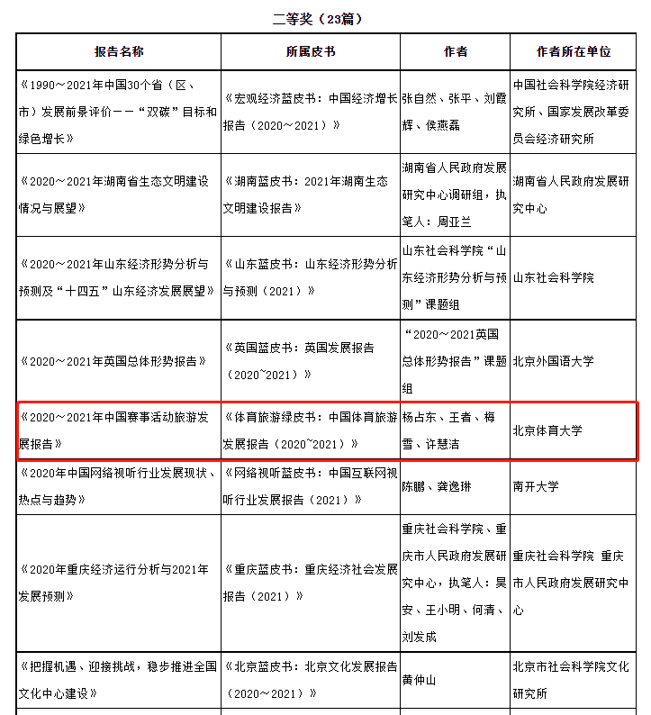 杨占东老师团队撰写、收录于《体育旅游绿皮书:中国体育旅游发展报告(2020~2021)》中的研究报告《2020~2021年中国赛事活动旅游发展报告》荣获第十三届“优秀皮书报告奖”二等奖。