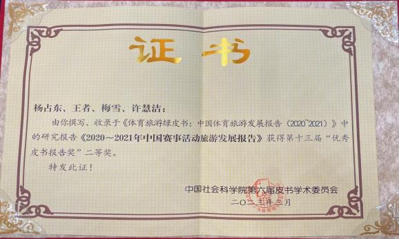 杨占东老师团队撰写并收录于《体育旅游绿皮书:中国体育旅游发展报告(2020~2021)》中的研究报告《2020~2021年中国赛事活动旅游发展报告》荣获第十三届“优秀皮书报告奖”二等奖。